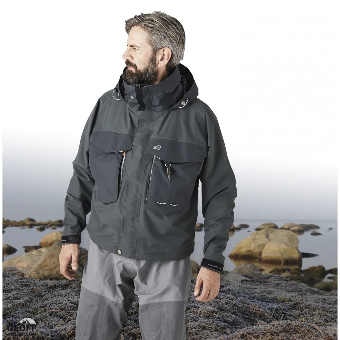 Nuova giacca completamente impermeabile e traspirante con cerniera resistente alla salsedine. Ottima per proteggersi da pioggia e vento. Dotata di capuccio che segue i movimenti della testa, 2 tasche con chiusura magnetica e tasca interna, tutte impermeabili. 7 tasche in totale. Questa giacca offre un naturale movimento durante la pesca. Polsini in Lycra con buchi per i pollici. Colore verde grigio (sul sito Geoff Anderson è riportato come Black/green).