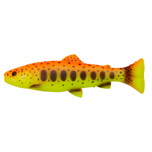 Artificiale shad perfetta imitazione di una trota, all'interno della coda è posizionato un rattle per richiamare i predatori. Lunghezza 12,50 cm peso 35 grammi. Colore Golden Albino. Azione moderate sink.