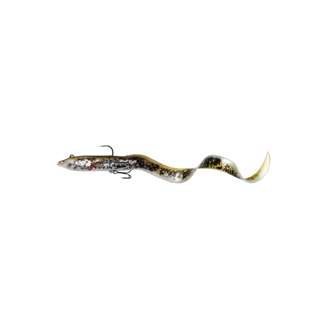 Imitazione di anguilla siliconica già montata con ancoretta sul ventre robusta 1X e amo sul dorso con colori 4D. Lunghezza 20 cm peso 38 grammi. Rattling in acciaio all'interno. Colore Olive Pearl PHP