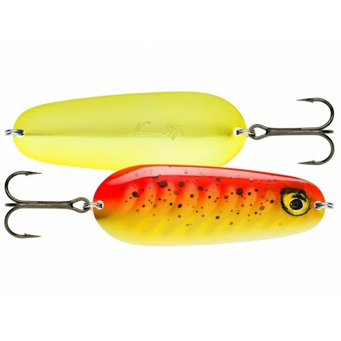 Cucchiaino ondulante con un'azione ampia e scodinzolante, le finiture moderne combinano i colori dei cucchiaini tradizionali con i modelli realistici in HD. Lunghezza con ancoretta 13 cm, solo corpo 9,5 cm. Peso 37 grammi. Colore Gold Fluorescent Red